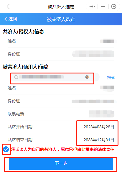 第三步:輸入被綁定人身份證號,選擇共濟(jì)時間,勾選承諾,點(diǎn)擊下一步,綁定成功。