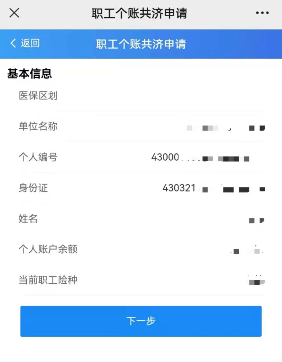 第二步:確認(rèn)參保信息,在個人賬戶有余額且參保狀態(tài)正常的情況下,點(diǎn)擊下一步。